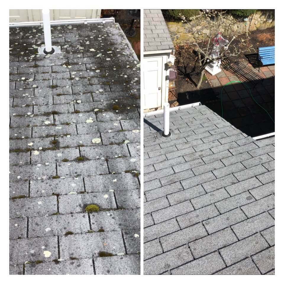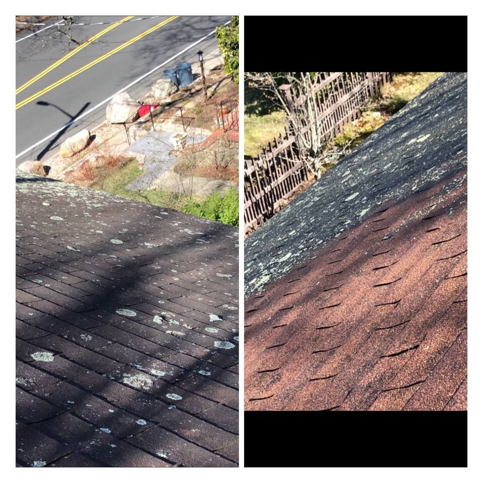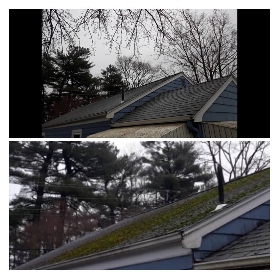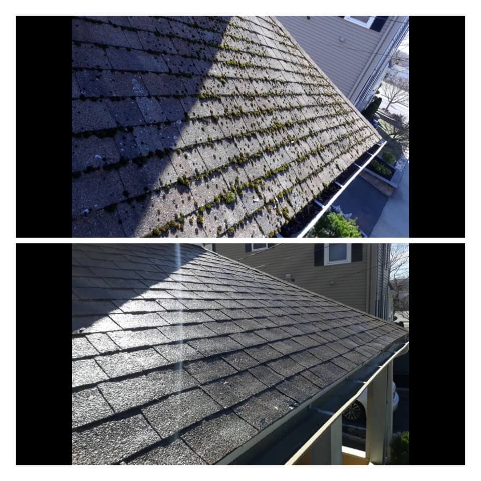 HiCleaners is the most experienced company in Chestnut hill, MA that deals with roof washing and roof soft washing. All of our employees are trained to recognize precise solution mixing ratios to provide you with the safest and most effective soft washing service. Roofs are a commonly neglected part of a house due to the fact that most people don’t have ladders to access it, so it is very easy to just leave it alone and forget about problems that may start to arise. Just like many home owners, discoloration and small bits of moss on a roof can be overlooked because of the misconception that it is just aesthetic. However, it isn’t just aesthetic, the moss slowly lifts the granules off the shingles which in turn shorten the life of the shingle. The moss also spreads, just like any bacteria if it is left alone for too long, it can quickly become a problem that spirals out of control. Call HiCleaners for a free quote, we only use the most advanced eco-friendly solutions and equipment to make sure the job is done right, for the safety of the employees, your plants, grass, pets, and children.